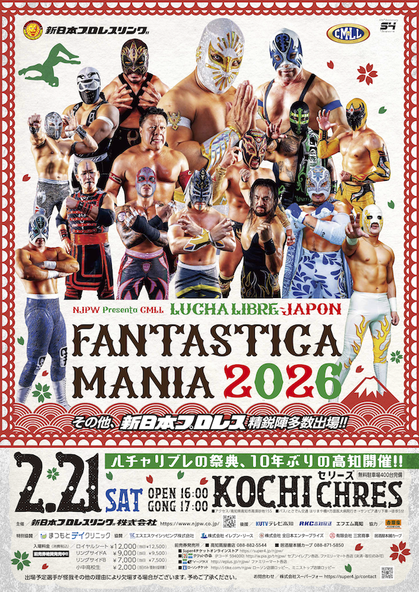 □『NJPW PRESENTS CMLL FANTASTICA MANIA 2026』高知大会は2026年2月21日(土) 詳細はコチラ!スーパーフォー先行は12月13(土)12:00~12月19日 スーパーフォー先行は12月13(土)12:00~12月19日(金)23:59 一般発売は2月12日(木)23:59まで